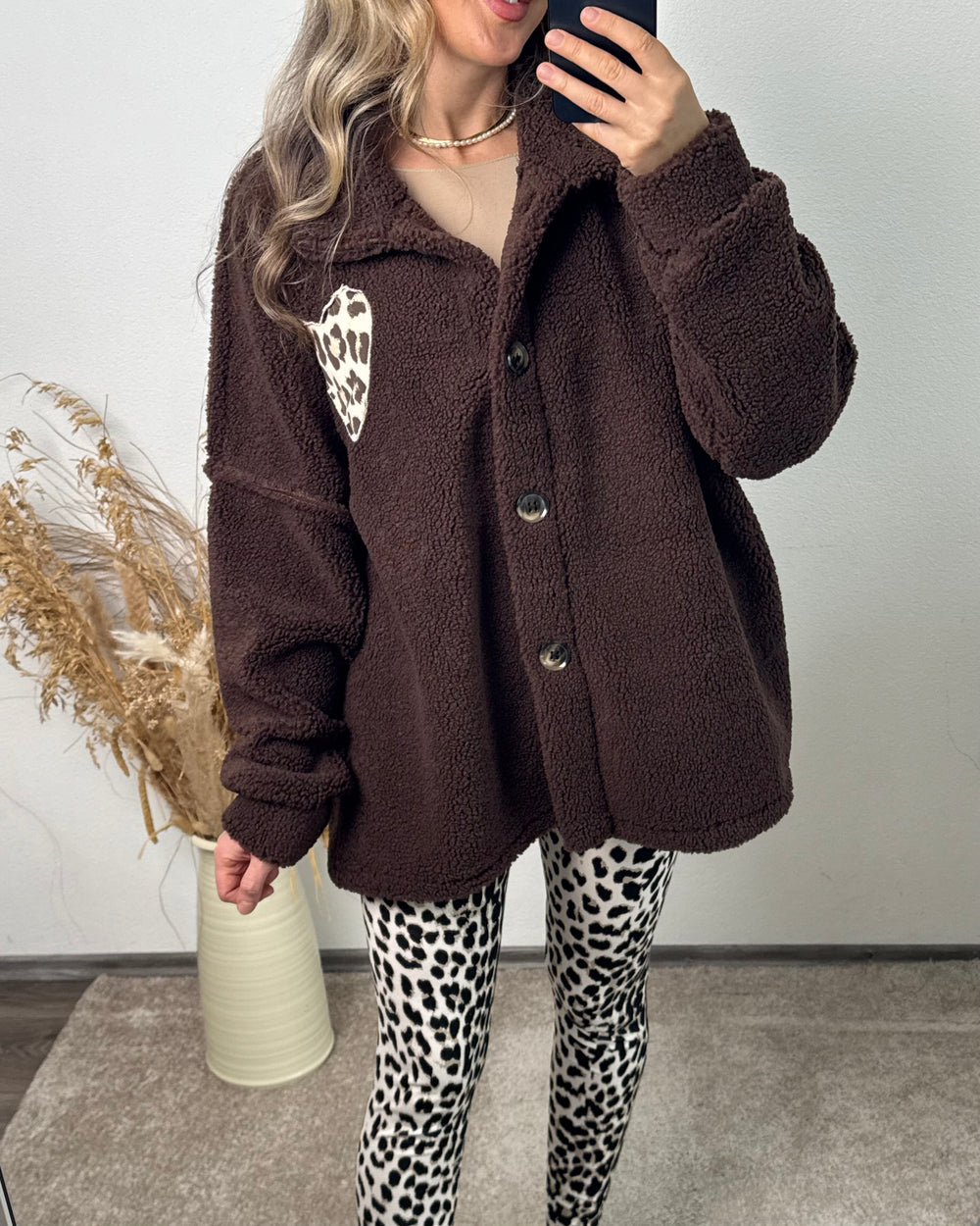 Mariana | Casaco Teddy Castanho com Estampado Leopardo e Coração